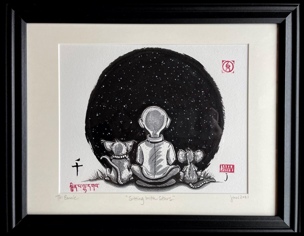 i recently completed a couple of commissioned art pieces. one was a calligraphy and enso, which i cannot show, because it is a gift for someone. the other was a commissioned recreation of an Inktober piece i did back in 2018. that year, i did an illustration series that featured a young novice monk, a Zen master cat, and a tag along rat friend. one of the illustrations was the three of them sitting with the night sky filled with stars, with their backs to us. i called it “Sitting With Stars.”