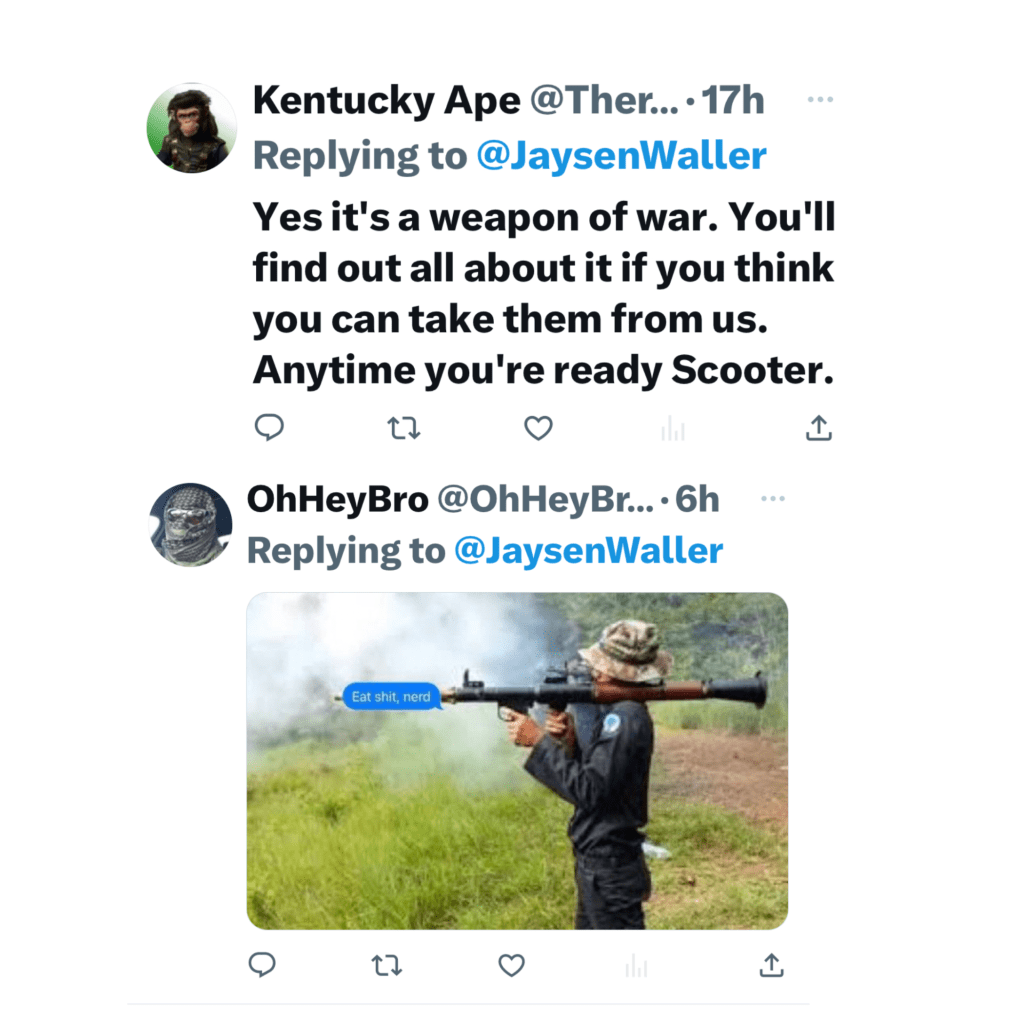 this is what happens every time i even suggest there should be space for dialogue around 2A and AR-15s along with weapons like it, and express frustration at our willingness to let children and whole crowds of people to continue to be massacred…and these are the tame replies.