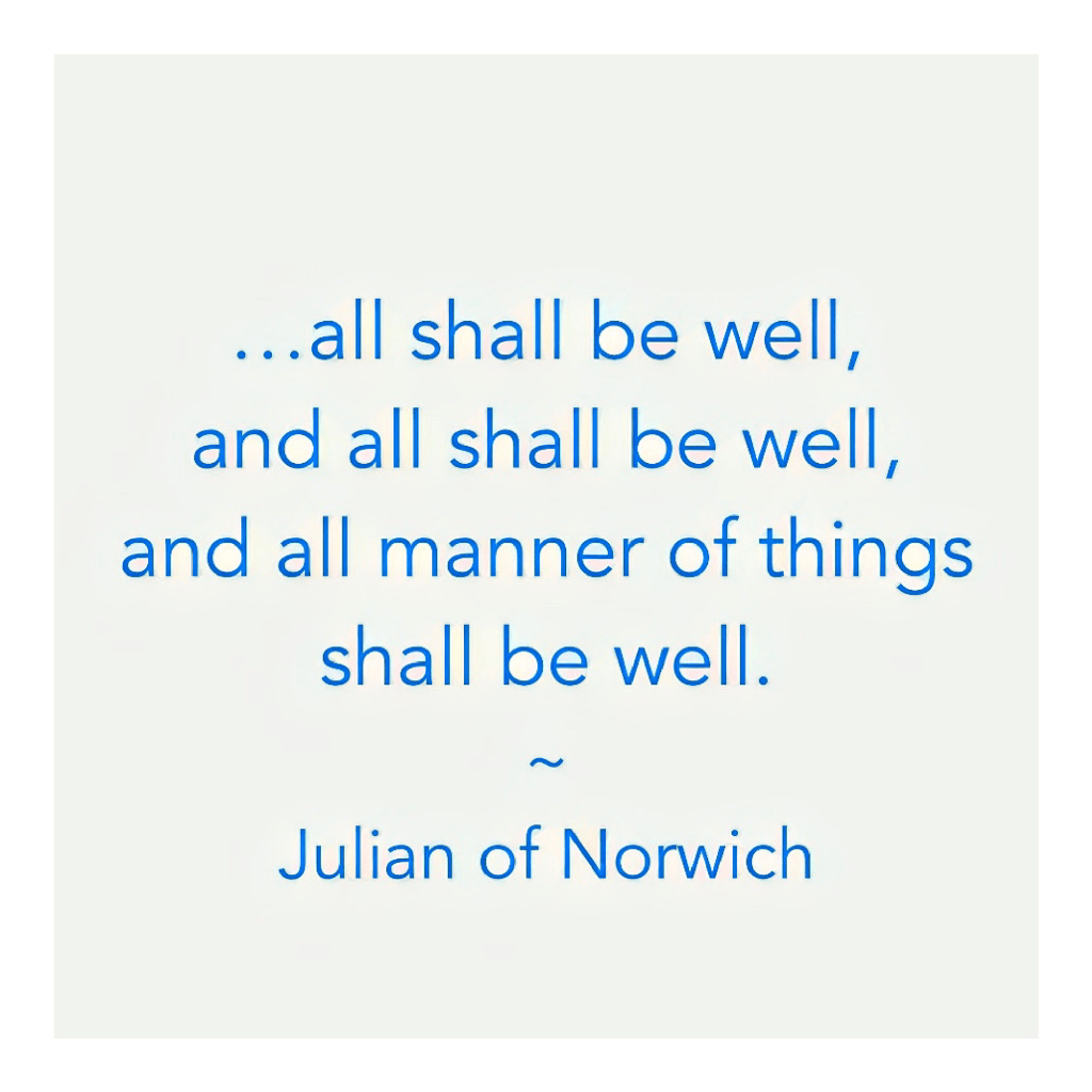 *Julian of Norwich was a 14th Century Christian Mystic and contemplative. A devout Roman Catholic, Julian was an anchoress, a solitary, who during deep illness almost to the point of death, received visions or as she called them, and later titled her writings, Showings. In these “showings” Christ came to her and she saw no blame in his heart, only pure love and compassion, like that of a mother. She came to understand this love as one absolutely committed to universal restoration or universal salvation, pushing the boundaries of the Church’s more mainstream understanding.