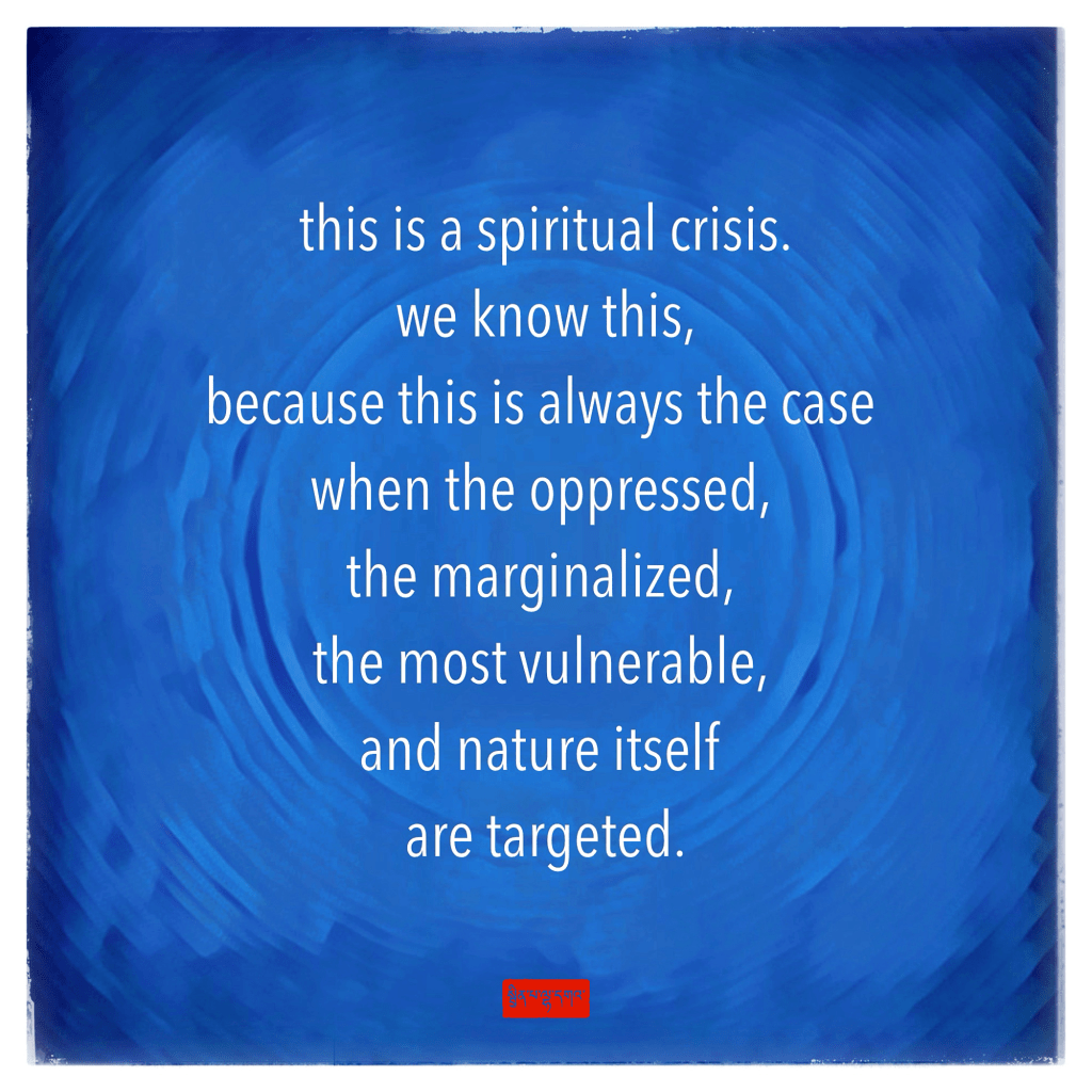 …we are living in a moment when we are being told up is down & down is up. but such cruelty, no matter how vocally it is being presented as moral & righteous by the most zealous or fraudulent, goes against everything i learned as a young Christian following the teachings of love from Jesus, or as a practicing Buddhist who centers awareness of our interdependence, non-harming, & fierce compassion as the embodiment of such love.