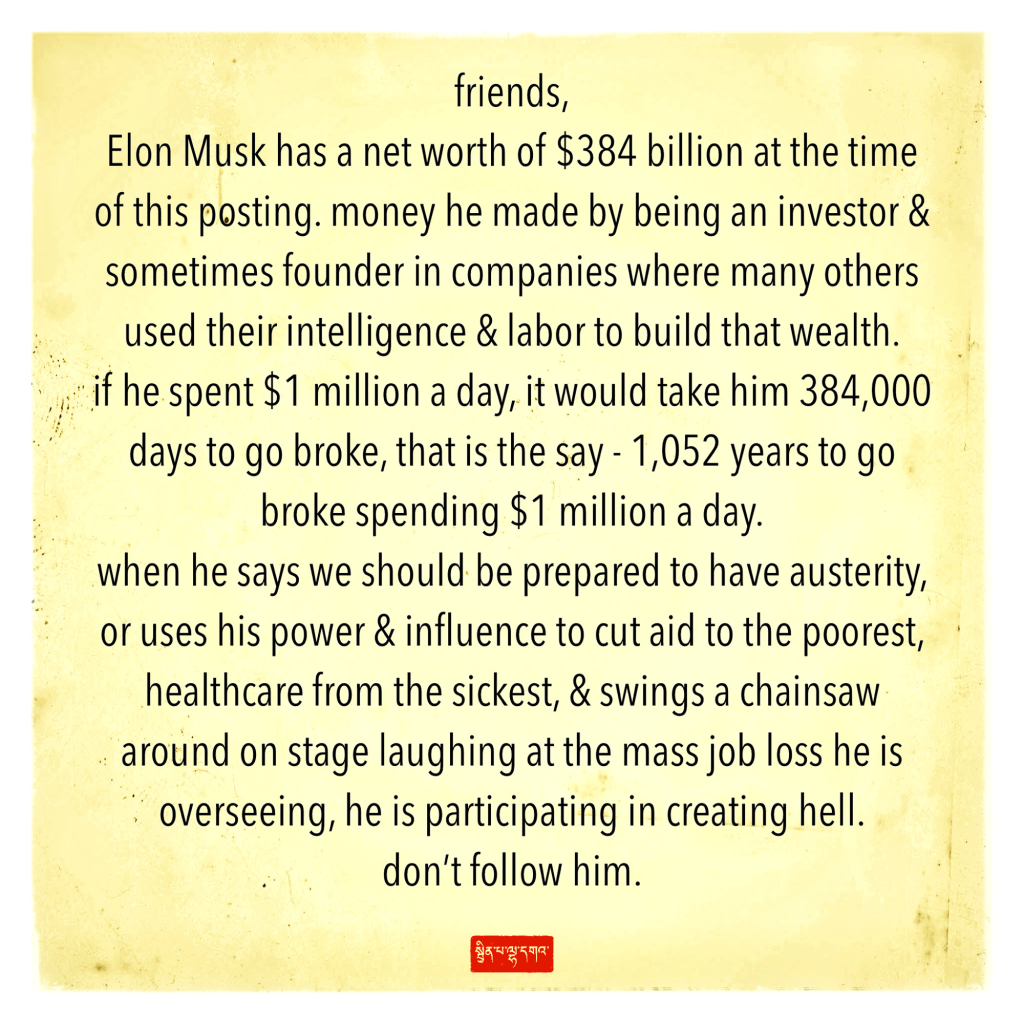 should the richest man in the world – not elected, not confirmed by Congress, working illegally, & outside the Constitution – tell us or them, their SSI is too much – breaking the bank? not worth the effort to heal? not worthy of food or housing?