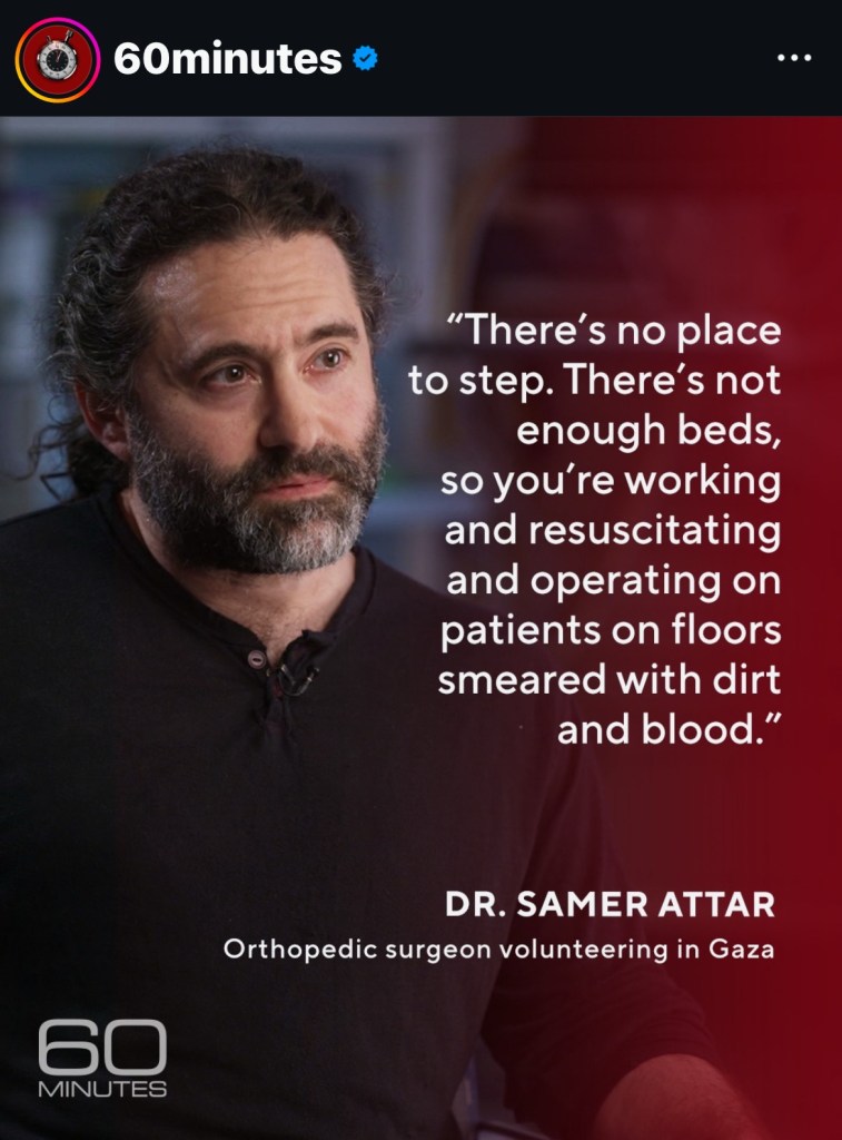 the continuing suffering, immense suffering, being endured disproportionately by Palestinian children especially, must be faced. we must allow our hearts to be broken. i share this in no way to diminish the suffering of the Israeli families affected by the horrors of 10/7, or the hostages & their families, which 60 Minutes touches on in this episode & devoted a segment to in the previous week’s episode. the sheer magnitude of mass death & destruction that continues though can’t be ignored. may we see all life as sacred, valuable, & worthy of our love.