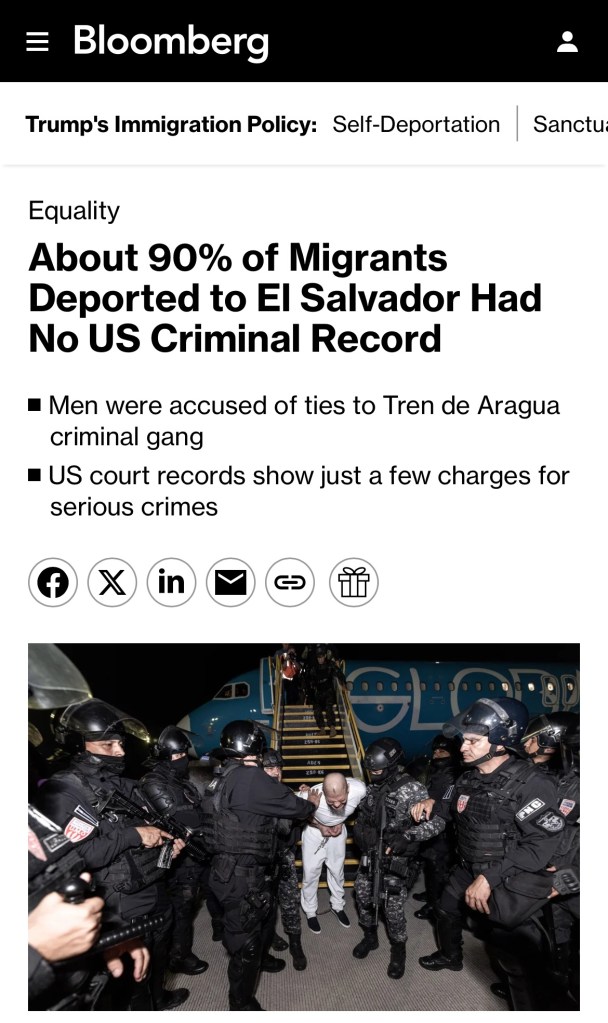 60 Minutes’ investigation stated 75% of the 238 men snatched up and sent to the El Salvadorian gulag without due process and in violation of a District Judge’s stay/non-transport order, had no criminal record. Bloomberg’s investigation states upwards of 90% don’t have criminal records. a portion of these men also have/had legal status to be in the US.
