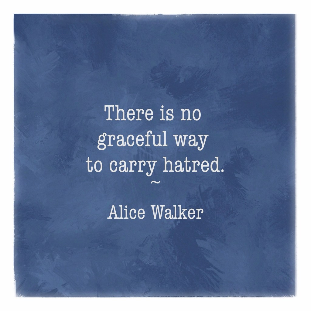 “Watching you hold your hatred for such a long time I wonder: Isn’t it slippery? Might you not someday drop it on yourself? I wonder: Where does it sleep if ever? And where do you deposit it while you feed your children or sit in the lap of the one who cherishes you? There is no graceful way to carry hatred. While hidden it is everywhere.”