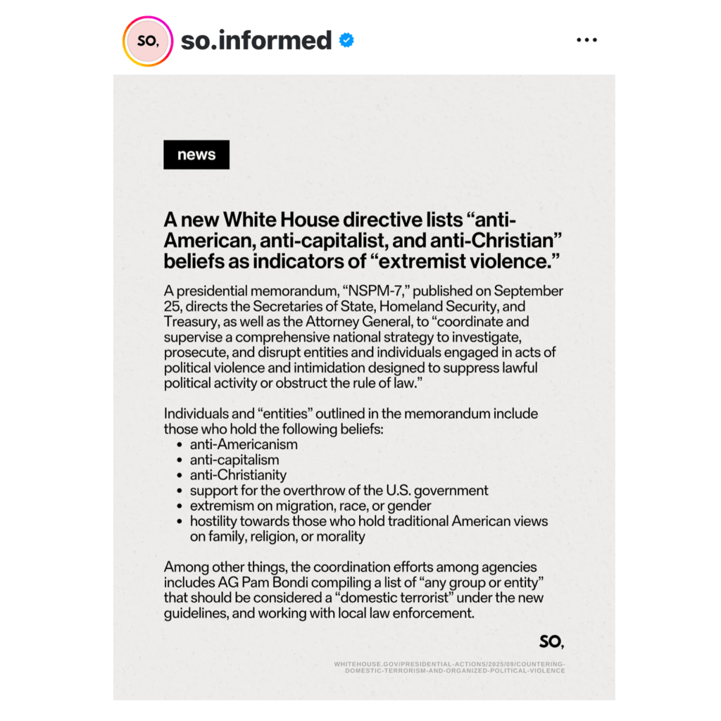 though NSPM-7 will be contested in court, people across political ideologies should be concerned. is any criticism of policy, economic or otherwise, now considered extremist? is any criticism of ICE throwing elderly people to the ground or disappearing citizens considered extremist? if we are LGBTQ+ or believe in a woman’s bodily autonomy, are we being “hostile” to “those who hold traditional American views on family, religion, or morality”? is any legitimate opposition to the President or US policy, now considered an attempt at “overthrow”? you may think you’re safe because you have “Jesus follower” in your bio, but are you really safe based on the government’s idea of what a Christian is? do you follow the same Jesus as those in charge, are you the correct kind of Christian? perhaps, though it seems to me you aren’t if you follows Jesus’ teachings on the least of these & his criticism on religious elite & empire. who decides what is extremist today? tomorrow? when will you or your family, or friends fall out of the good graces of the leader simply because you have & act on empathy, kindness, compassion, love? fascism’s appetite is never satiated. now is the time to speak out of love & with love. now is the time to stand in solidarity with values that are democratic & the best of what we believe the US has been & could be, because we love our country, because we love our family & friends, because we are called to love our neighbor.