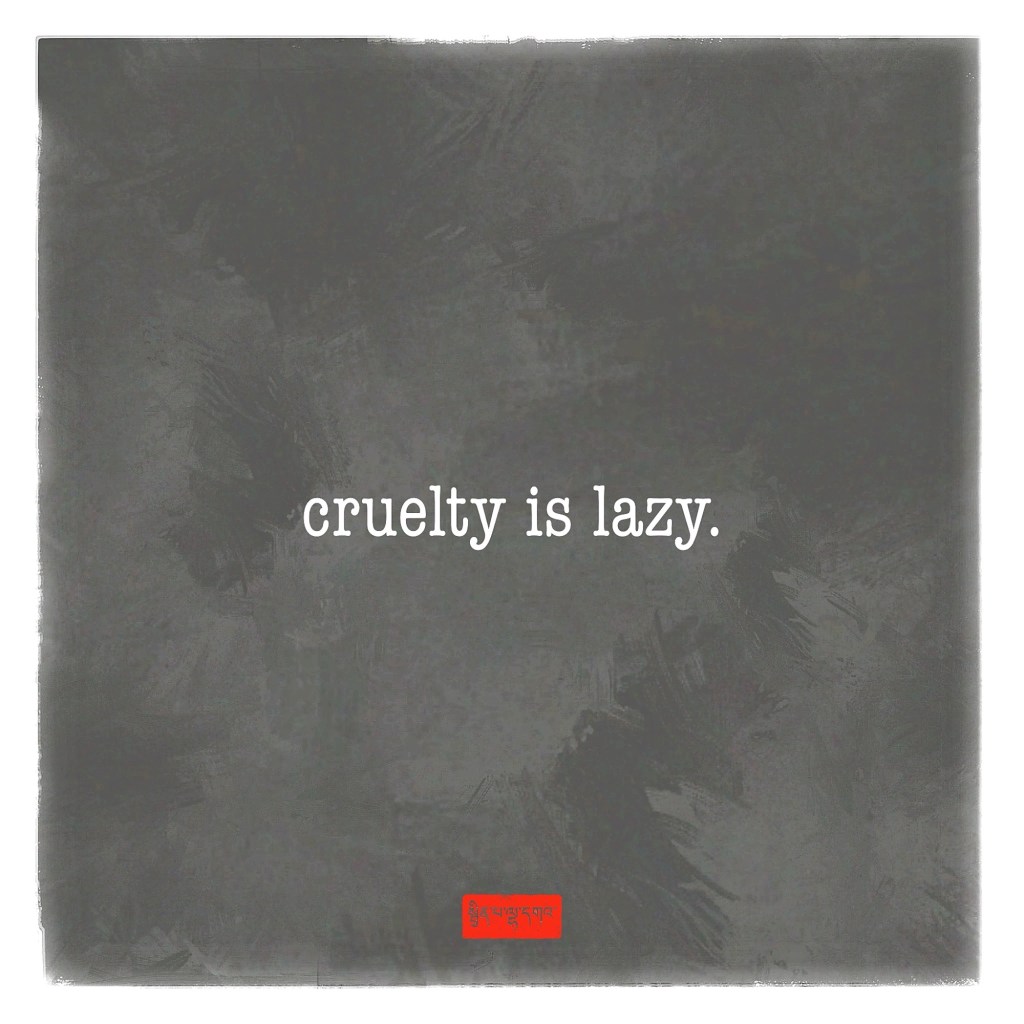 cruelty is lazy. it requires nothing of the people being cruel, other than surrendering to the basest part of their nature. cruelty places the entire burden on its victims. it exchanges authentic relationship for dominance. this is the opposite of love, which requires work, requires us to make a choice to not harm, to engage our creativity, our hope, & our energy, to actively be in relationship, committing to serving others & our world for the benefit of all.