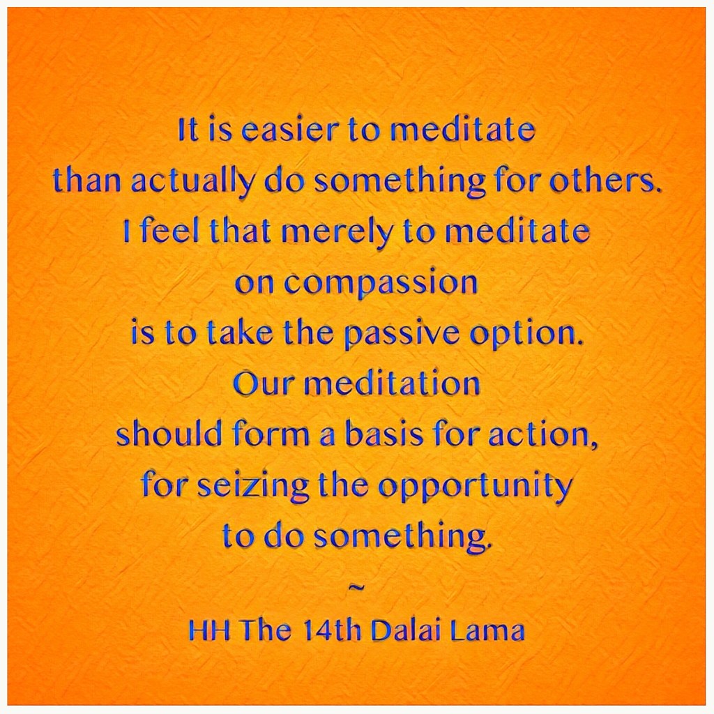 our meditation practice supports and equips us for having the spaciousness to choose beneficial action and not just react. we can have an active role in non harming, in a world that has seen too much aggression and destruction.