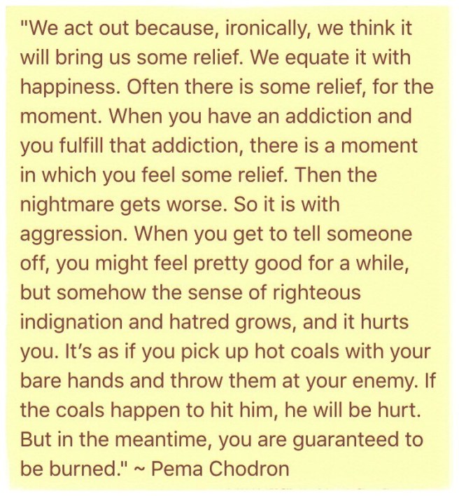 our experience of anger can also be an opportunity to investigate what gets under our skin and eats at us. what makes us lose our cool, how fast do we lose it? are we acting out of anger with our words and actions, adding to the harm and suffering in the world?